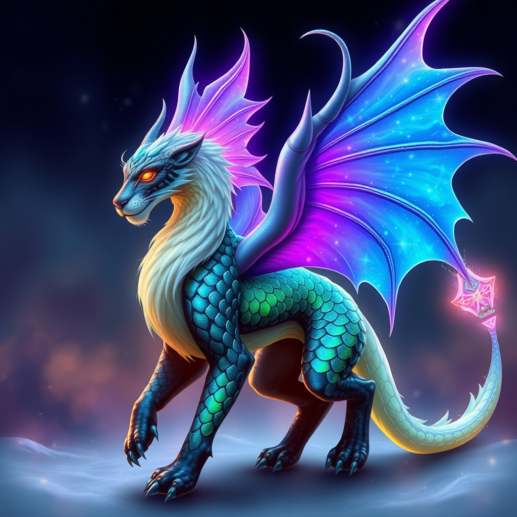A majestic chimera with the wisdom and intellect of a human, the agility and grace of a panther, and the ethereal wings of a dragon, possessing shimmering scales that shift colors like a kaleidoscope, glowing eyes that see beyond the ordinary, and a voice that resonates like a harmonious symphony.