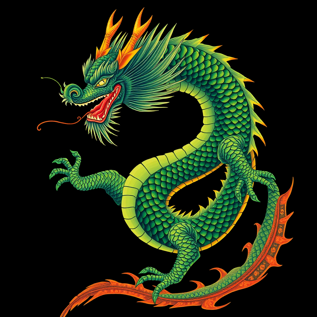 A majestic Chinese dragon depicted with bold, graphic compositions in dark green and amber hues against a deep black background, exuding vibrant energy. The creature showcases a precarious balance, gracefully intertwined with elements of light green and red, reminiscent of the distinct style of Mark Brooks. Its scales shimmer with a hypnotic blend of colors, capturing the essence of myth and artistry.