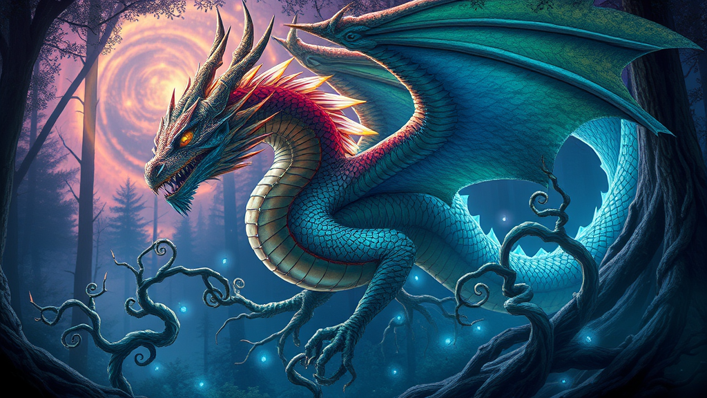 A majestic chrono dragon, scales shimmering with the hues of ancient timelines, is ensnared by intricate magical tree roots, their gnarled tendrils spiraling around its limbs with ethereal luminescence. The roots, pulsating with a life of their own, bind the dragon in a delicate dance of nature and magic amidst a forest bathed in twilight. Each root seems to hum with enchanted power, contrasting the dragon's fierce yet serene eyes that reflect the wisdom of ages. In the backdrop, an aurora of time swirls, casting a mosaic of colors across the scene, as if the very essence of history is woven into this mystical encounter.