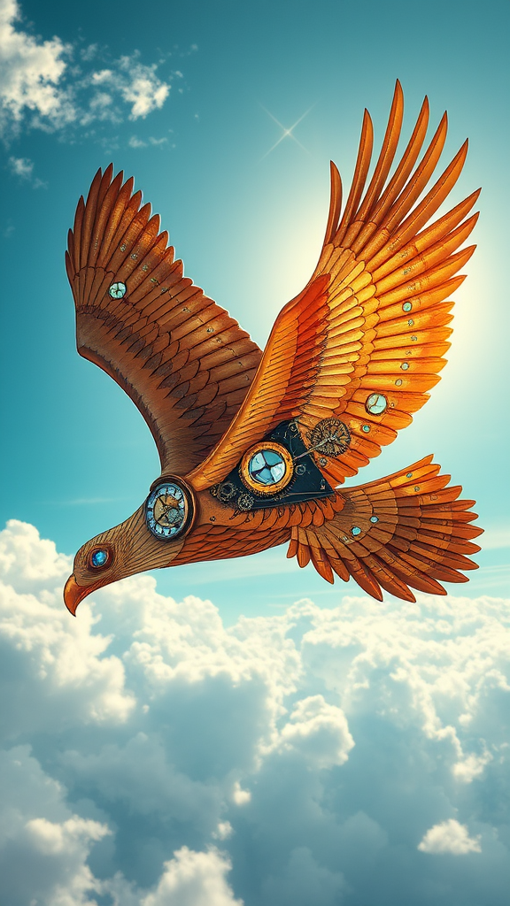 A majestic clockwork eagle soars through the sky, its wings a mesmerizing tapestry of brass feathers and intricate gears. The sun gleams off its polished copper body, casting rainbows through the tiny stained glass inlays on its wings. Steam puffs gently from vents along its spine as it navigates the aether currents with precision. Its eyes, made of gleaming sapphire lenses, focus intently, scanning the landscape below with mechanical acuity. A symphony of ticking and whirring accompanies its flight, the embodiment of steampunk ingenuity and avian grace.