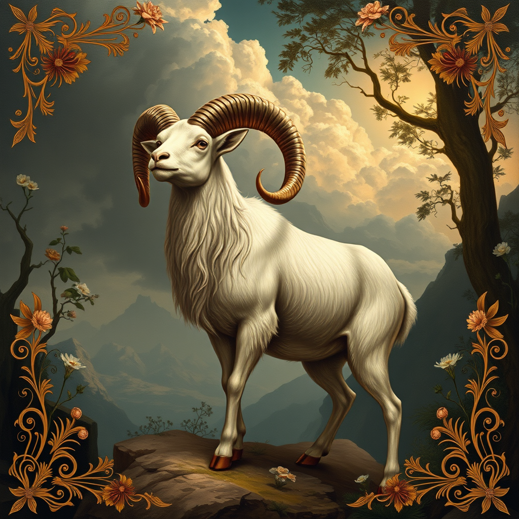 A majestic creature, a ram with a single horn, stands gracefully, embodying the elegance of an otherworldly illustration. Inspired by the serene landscapes of Robert S. Duncanson, it evokes a sense of queer academia with an air of intellectual mystique. The scene is embellished with magnified ornamentation reminiscent of Olafur Eliasson's intricate designs, blending 18th-century elegance with a touch of modern surrealism. The composition is presented in high-resolution, with a 3:4 aspect ratio, capturing the essence of a timeless, fantastical moment.