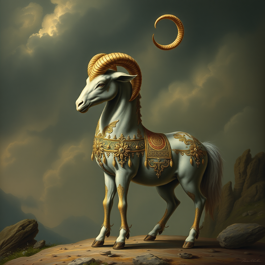 A majestic creature, resembling a ram-horse hybrid, stands gracefully, adorned with a singular, spiraling horn that gleams ethereally. The scene is captured in a style reminiscent of otherworldly illustrations, evoking the enchanting landscapes of Robert S. Duncanson. Hints of queer academia add a layer of intellectual mystique, while intricate, magnified ornamentation adorns the creature, reflecting the avant-garde aesthetics of Olafur Eliasson. The composition pays homage to 18th-century artistry, presented in exquisite high resolution, with an aspect ratio of 3:4, where every detail, from the luxurious textures to the sublime interplay of light and shadow, invites the viewer into a realm both familiar and fantastical.
