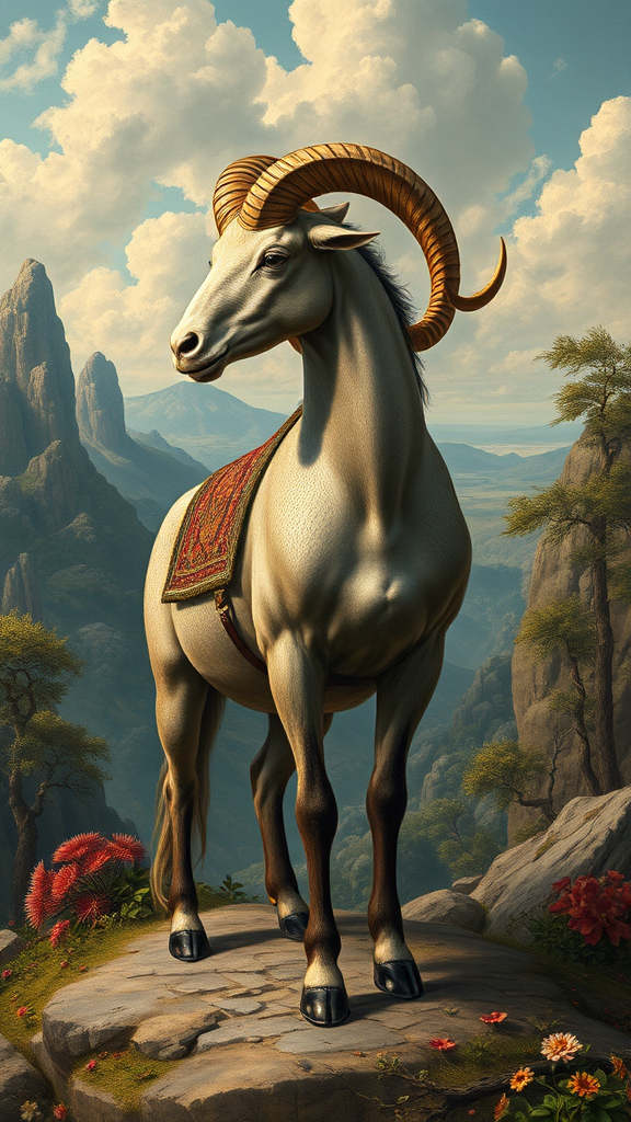 A majestic creature, resembling a ram with a single luminous horn, stands poised, seamlessly blending equestrian grace with mythical allure. The scene is reminiscent of otherworldly illustrations, evoking the rich and vivid landscapes of Robert S. Duncanson. Captured through the lens of queer academia, the image is imbued with an ethereal elegance, adorned with magnified ornamentation. The essence of Olafur Eliasson's transformative art shines through while being steeped in the ornate aesthetics of the 18th century. Rendered in high resolution, the tableau invites viewers on a journey through time and imagination, as intricate patterns and vibrant hues dance harmoniously across the canvas.