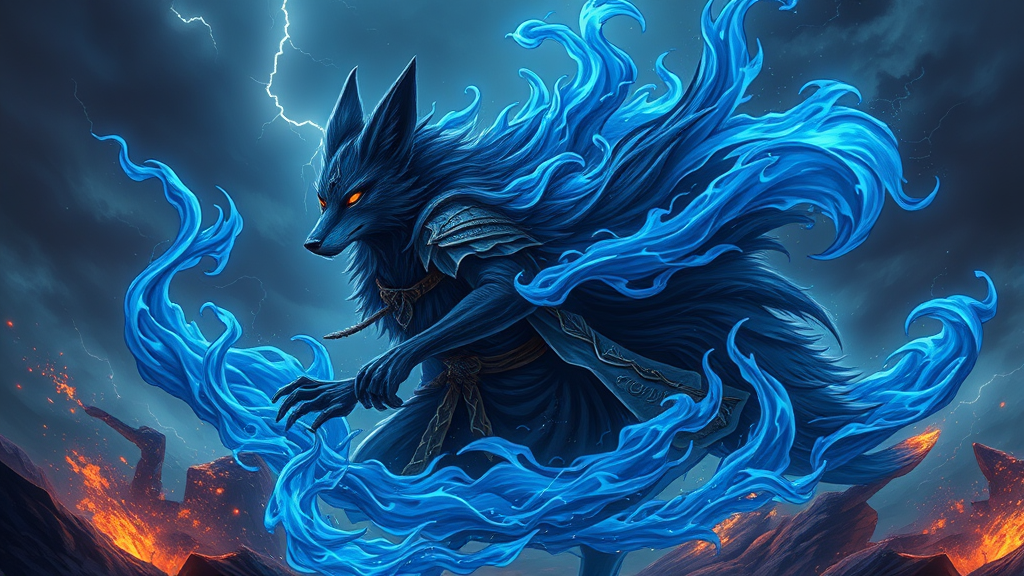 A majestic dark fox warrior enveloped in swirling dark blue flames of ethereal energy, depicted with stunning 8K resolution. This sorcerer, a humanoid prince from the shadows, dominates the battlefield with commanding presence. Surrounding him are mesmerizing blue infernal flames that dance and crackle amidst electric sparks in the backdrop, set against an apocalyptic scene. The illustration is vibrant and teems with intricate details, capturing an elegant yet ominous atmosphere. The digital artwork is breathtakingly vivid, portraying a hyper-detailed landscape beneath a turbulent thunderstorm sky.