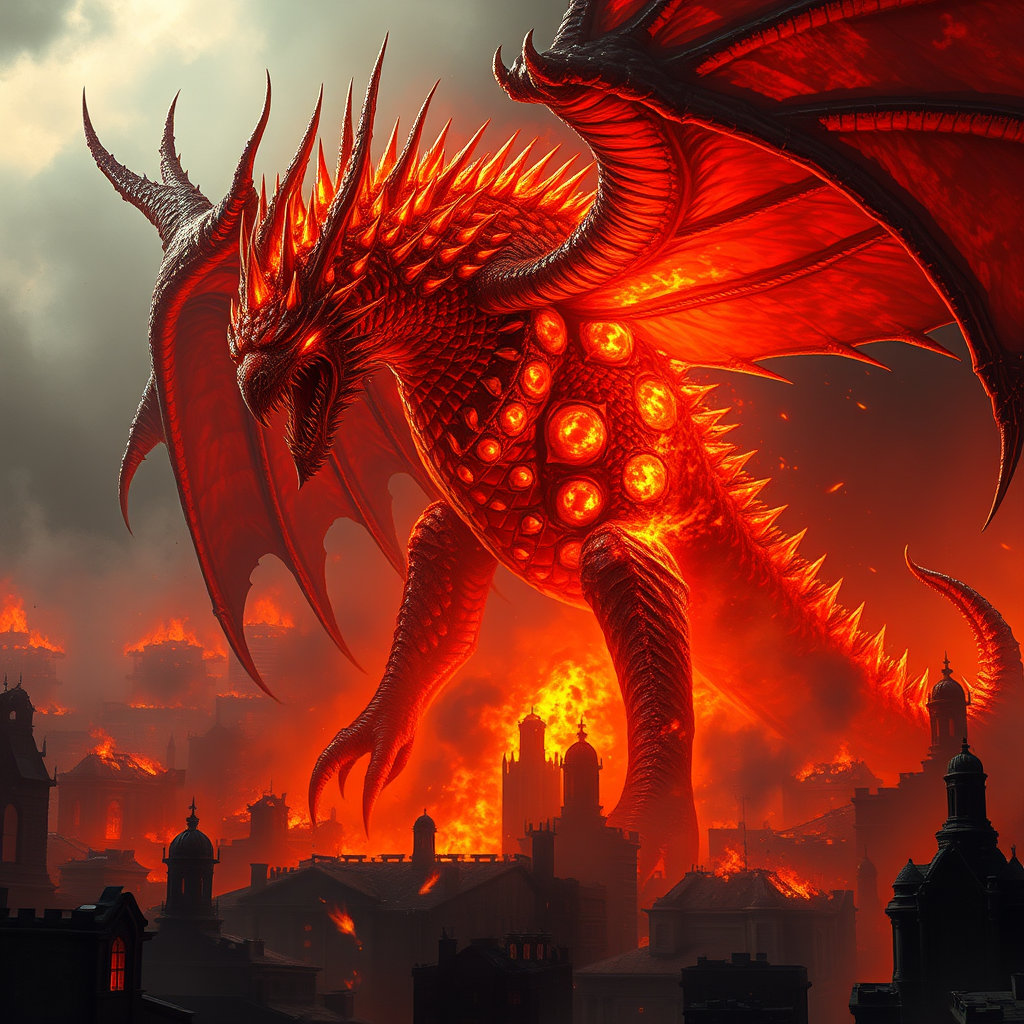 A majestic Deathwing engulfed in fiery flames towering over the cityscape, its molten bronze scales gleaming ominously amidst a sea of dark red and shadows. The scene is intricately detailed, showcasing the fearsome spiky mounds on its back, with each spike reflecting the intensity of the blazing inferno. The creature's eyes burn with an exaggerated, menacing expression as it reigns chaos below. Set against an apocalyptic backdrop, the city crumbles under the relentless heat, embodying a sense of despair and awe. This stunning artwork, reminiscent of Bayard Wu's meticulous style, intertwines elements of crowcore with dark elegance, capturing the raw power and beauty of this fantastical beast.