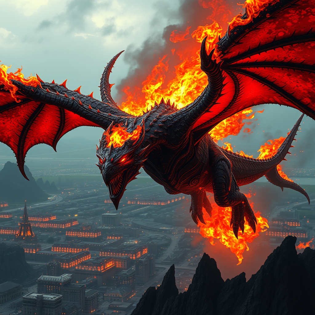 A majestic Deathwing engulfed in flames soars above a sprawling cityscape, the blazing fire casting an ominous glow over the landscape. Its wings are vast, dotted with intricate, spiky protrusions that shimmer dark bronze and vibrant red under the fiery light. The creature's expression is exaggerated, eyes ablaze with a fierce intensity that captures an almost sentient rage. Around it, wisps of dark smoke and flickering flames rise like a sinister halo, each stroke rendered with meticulous detail akin to a Zbrush sculpture. The backdrop is punctuated by jagged hills, reminiscent of crowcore aesthetic, stark and brooding. In this stunning, referential style reminiscent of art by Bayard Wu, the entire scene pulsates with vivid life and a captivating narrative depth.