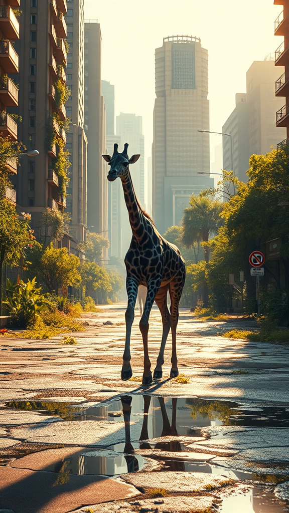 A majestic, disfigured giraffe moves gracefully through a dystopian post-apocalyptic cityscape, where towering buildings are overgrown with vibrant vegetation and nature has reclaimed the urban environment. The city is bathed in bright, cinematic sunlight, casting long shadows and lighting up the scene with an almost ethereal glow. Reflective puddles dot the cracked streets, capturing distorted glimpses of the giraffe with its distinctive blue head, creating a surreal yet captivating image. This vivid landscape, rendered with highly realistic and detailed 8k quality, showcases a breathtaking contrast between the remnants of civilization and the lush resurgence of nature.