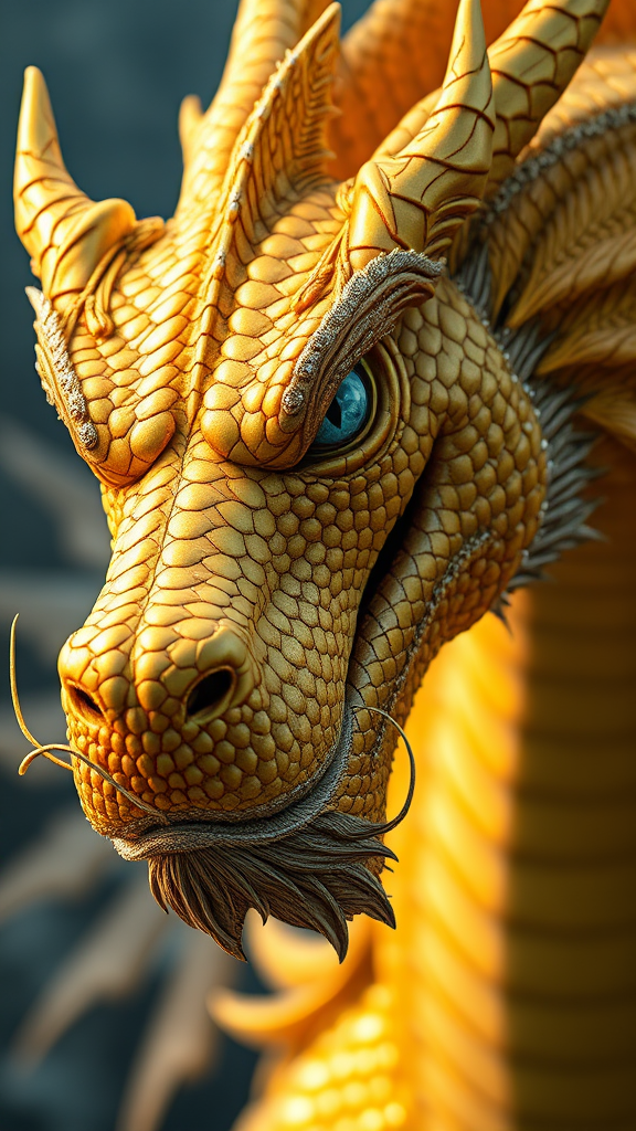 A majestic dragon gazes across the horizon, eyes filled with profound intelligence and wisdom. His vibrant gold scales are delicately lined with exquisite flecks of silver, creating a shimmering effect under the soft, warm light. His piercing blue eyes, framed by delicate frills along his head and chin, reveal a depth of understanding beyond time. The dragon's form is rendered in hyper-realistic detail, with each scale meticulously defined and reflecting an astonishing level of craftsmanship. The scene is captured in a sharp focus, emphasizing the ultra intricate details of his claws and powerful body, set against a backdrop of volumetric lighting that enhances the aura of elegance surrounding him. Photorealistic elements blend seamlessly with the ultra-realistic textures, making the dragon's presence both awe-inspiring and otherworldly. In contrast, imperfections and quirks add character to his visage; subtle asymmetries, suggestive of age and experience, contribute to his unique beauty. The scene is immortalized in an 8k HDR octane render, with a depth of field that draws the viewer into the dragon's world, capturing the essence of timeless majesty and complexity.