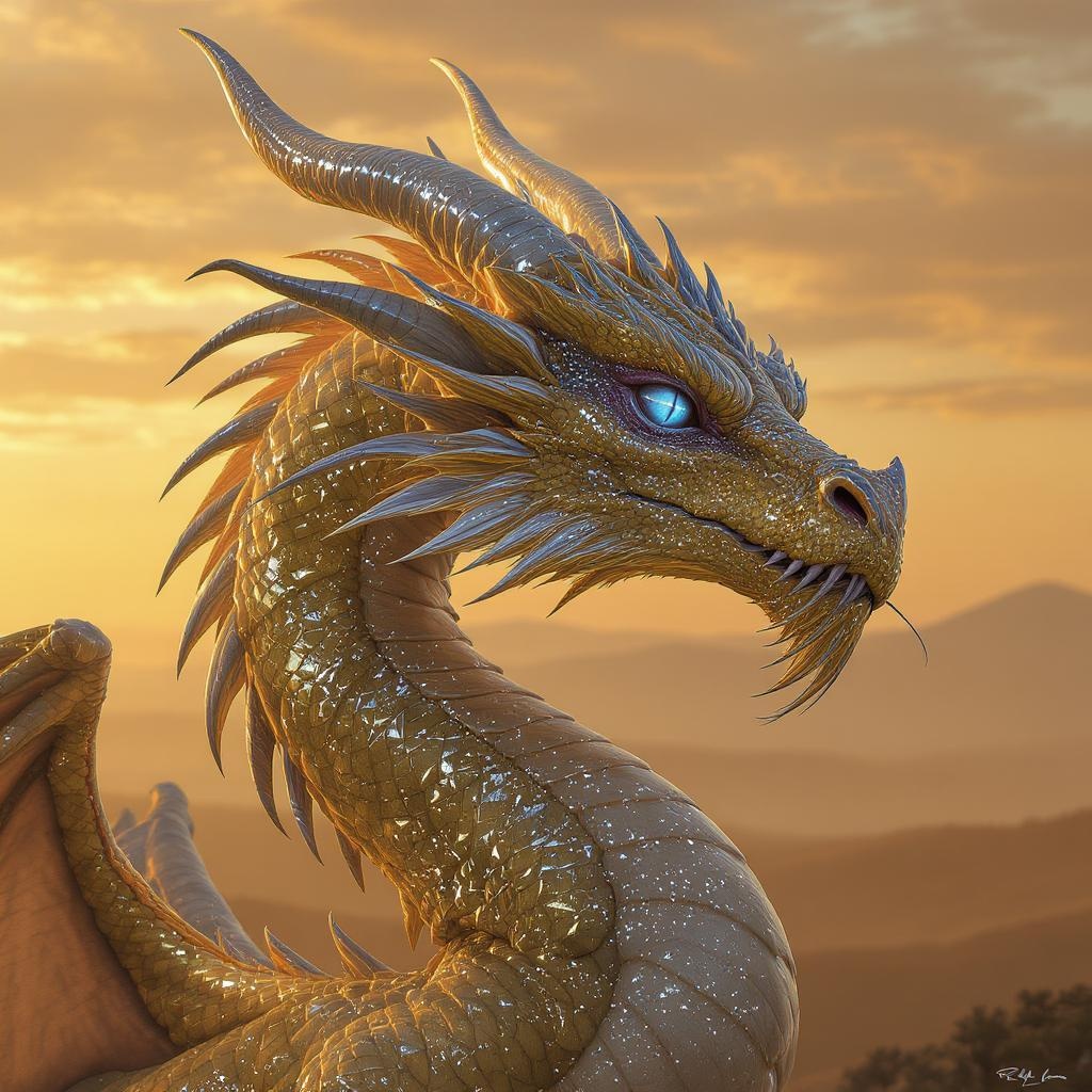A majestic dragon gazes across the horizon, his eyes brimming with profound intelligence and wonder. His vibrant gold-lined scales shimmer with exquisite flecks of silver, reflecting the ethereal glow of the setting sun. His deep blue eyes, set beneath small, elegant frills along his head and chin, convey wisdom and grace. Volumetric lighting enhances the sculpted details of his razor-sharp claws and intricately textured body, showcasing the individual scales in hyper-realistic detail. Despite the ultra-detailed, HDR rendering that brings this 8k scene to life, the dragon retains an air of elegance even in his unique imperfections. Subtle, asymmetrical features lend him character—a slight deviation in the alignment of his facial frills and a gentle, almost imperceptible ripple in his scales. The depth of field is meticulously crafted, ensuring sharp focus on the subject, which adds to the overall photorealism and allure of this creature. With quaint embellishments and creative nuances, this portrait captures the essence of an otherworldly being in its natural, elegantly imperfect state.