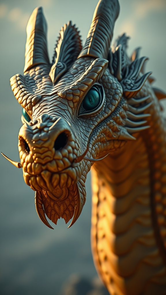 A majestic dragon gazes across the horizon with eyes exuding glorious intelligence, its vibrant gold-lined scales adorned with beautiful flecks of silver. Its deep blue eyes shimmer beneath the soft luminescence of volumetric lighting. Small frills embellish its noble head and chin, and the dragon’s form is captured in ultra-realistic detail: intricate scales, razor-sharp claws, and a detailed body that reveal the creature's power and grace. Rendered in HDR, 8k resolution, the scene highlights detailed lighting and hyper-realistic intricacy, crafted with octane render precision. The portrait places sharp focus on the elegant subject, surrounded by an artful depth of field, enhancing the photorealistic aesthetic. The dragon, while stunningly detailed, possesses a unique charm that includes subtle irregularities, such as additional eyes hidden among its frills, adding an unexpectedly captivating allure to its visage.