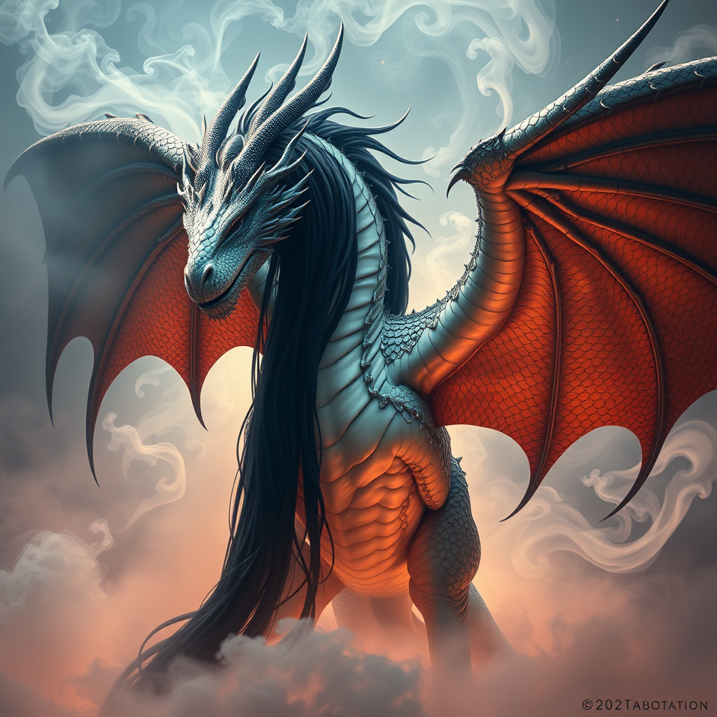A majestic dragon, massive and imposing, with long, flowing black hair cascading over its intricate scale wings, stands in an ethereal setting reminiscent of Magic the Gathering. Its pale skin contrasts vibrantly against the swirling spiral smoke enveloped in a luminous white fog, casting an enchanted aura. Crafted in the vivid and intricate styles of Andrei Riabovitchev and JohnnyD with influences from Massimo Caggese and Peter Mohrbacher, this scene emanates a sense of foreboding beauty. The image evokes the creativity of octane, moebius, and arney freytag, showcasing a dragon as the centerpiece of a high-fashion photo shoot, striking a gorgeous pose. Dramatic lighting and shadows enhance the scene’s depth, interwoven with elements of orthodox symbolism. This concept art, suitable for ArtStation, merges ambient magic realism with an 8k resolution canvas, embodying an exceedingly complex, hyper-maximalist, overdetailed cinematic tribal dark fantasy, stylized with flair.