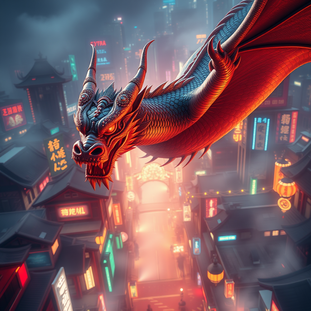 A majestic dragon soars through a modern cyberpunk fantasy cityscape, blending the elegance of Kyoto Animation-style anime with the intricate beauty of traditional Chinese art. The scene is bathed in cinematic lighting, with ethereal glows casting intricate shadows over the detailed urban landscape. Rich, vibrant colors emphasize the dragon’s scales and the city’s neon illuminations. The atmosphere is electrifying, with ultra-high-definition textures and hyper-detailed decorations reflecting the dragon’s passage. From an aerial viewpoint, the dragon’s sleek form is adorned with glittering jewelry, its fair scales shimmering against the dark, enchanting skyline. Its eyes meet the camera, exuding a sense of mystery and power. The scene is a harmonious masterpiece, rich in magnificent details and captured in stunning 8k resolution, balancing the gorgeous play of light and shadow.