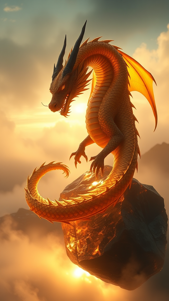 A majestic dragon spirals gracefully from a piece of amber, exuding a soft, ethereal glow. Its scales glisten with an inner light that pulses mystically, illuminating a cinematic landscape shrouded in delicate fog. The environment is breathtakingly epic, reminiscent of a fantasy realm at dawn, where shafts of golden light pierce through the mist. Captured with astonishing sharpness, the scene radiates an enchanting aura, akin to a winning photograph rendered with the unparalleled precision of the Unreal 5 engine.