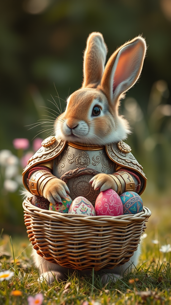 A majestic Easter bunny adorned in intricately ornamented light armor stands proudly, its fluffy fur gently ruffled by a soft breeze. It carries a beautifully woven basket brimming with vibrantly painted eggs, each displaying unique and ornate designs. The scene is captured with cinematic detail, evoking a sense of wonder and charm in a 70mm film-styled image, a blend of fantasy and whimsy in a lighthearted, yet epic tableau.
