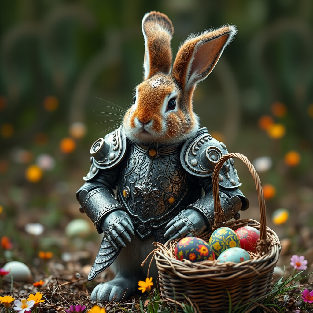 A majestic Easter bunny clad in intricately designed light armor, its fluffy fur peeking through the ornate metalwork, stands proudly. Nestled at its side is a basket brimming with vibrantly painted eggs, each one a tiny masterpiece of color and design. The scene unfolds with cinematic grandeur, bursting with vibrant detail, as if captured in a 70mm frame. The whimsical yet noble aura of this extraordinary creature tells a story of both fantasy and festivity.