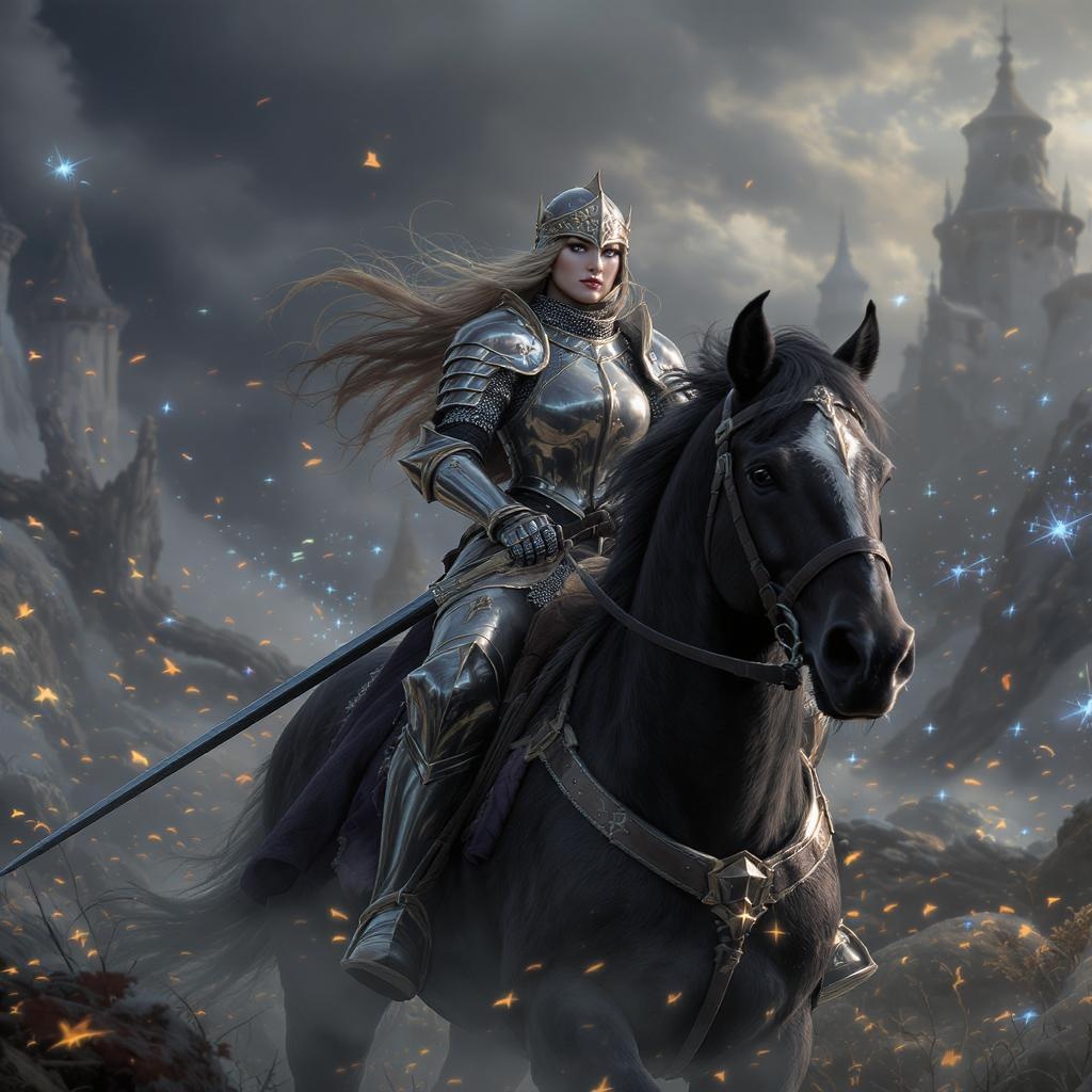A majestic female knight clad in intricate, full medieval armor journeys through a mystical, digital fantasy landscape. Her visage is noble, set against a backdrop of cinematic lighting that casts an enchanting glow over the scene, enhancing the medieval ambiance. She rides a powerful, majestic horse, both exuding an aura of strength and grace. Her helmet, ornately detailed, hints at a complex and storied past. Around her, the environment is alive with the whispers of an unseen RPG world, rich in depth and storytelling. The knight's hands are skillfully depicted, holding the reins with practiced ease, while her eyes, sharp and determined, focus on the path ahead. The scene captures the essence of a wandering knight on a relentless quest, harmoniously blending artistic finesse with the allure of a fantastical medieval adventure.
