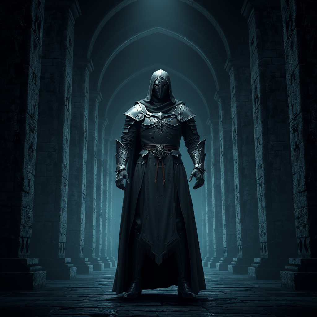 A majestic figure stands in a proud pose, draped in elegantly detailed gray armor, exuding an aura of strength and mystery within a dimly lit, medieval hall. The atmosphere is imbued with a dark fantasy ambiance, where shadows dance along intricate stonework. The scene is rendered in ultra high quality, capturing every nuance of the setting. The composition is perfectly symmetrical, with the figure centered amidst towering, ancient pillars that whisper tales of olden days. The digital artwork breathes life into a realm where the past and fantasy intertwine seamlessly.