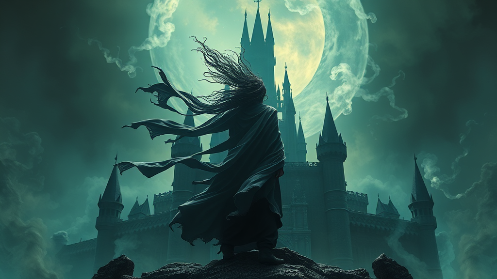 A majestic figure stands regally amidst an aura of darkness, with long windblown hair and flowing cloth that dance wildly in the air. The scene is reminiscent of a Magic the Gathering tableau, featuring vibrant contrasts and swirling clouds of toxic fumes and smoke forming spirals like ghostly apparitions against the backdrop of a colossal, shadowy castle. The composition, crafted with the artistic flair of Massimo Caggese, is oozing with ominous intricacy and finds its home on ArtStation. Dramatic shadows cast over the scene introduce orthodox symbolism, ambient occlusion creating depth and complexity, with an emotional, tribal dark fantasy ambiance. The wallpaper boasts ultra-detailed 3D quality, rendered with Octane and presented in a stunning Unreal Engine setup complete with awe-inspiring VFX and cinematic lighting. The scene is depicted in isometric perspective, meticulously crafted in Blender to achieve ultra-realistic textures and details, all presented in striking 8k resolution.