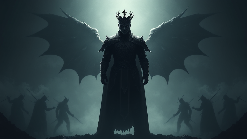 A majestic figure stands tall in a proud pose amidst a dark fantasy world, their silhouette cast in varying shades of gray. The symmetrical composition highlights their regal features, embodying a sense of medieval grandeur. The scene is rendered in ultra-quality digital art, bringing to life the hauntingly beautiful ambiance of a time long past, where shadows and light dance around the central figure in a mesmerizing display.