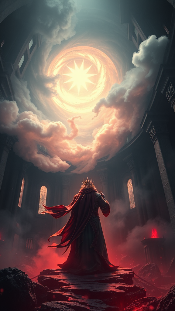 A majestic figure with royal aura stands in the heart of a colossal dark castle, their long windblown hair and flowing garment swirling amidst a spiral of ghostly smoke and toxic fumes. The scene evokes the intricate artistry akin to the works of Massimo Caggese, with a strong Magic: The Gathering influence. Dramatic shadows accentuate the vibrant contrasts between the toxic clouds and the dark, mysterious ambiance. Orthodox symbolism weaves through the image, casting an emotional, tribal dark fantasy mood. Crafted using Ultra-detailed Quality 3D techniques, the composition leverages the power of the Unreal Engine and Octane Renderer, enhanced by VFX for a cinematic feel. The isometric view, produced in Blender at an ultra-realistic 8k resolution, delivers an awe-inspiring, wallpaper-worthy piece.