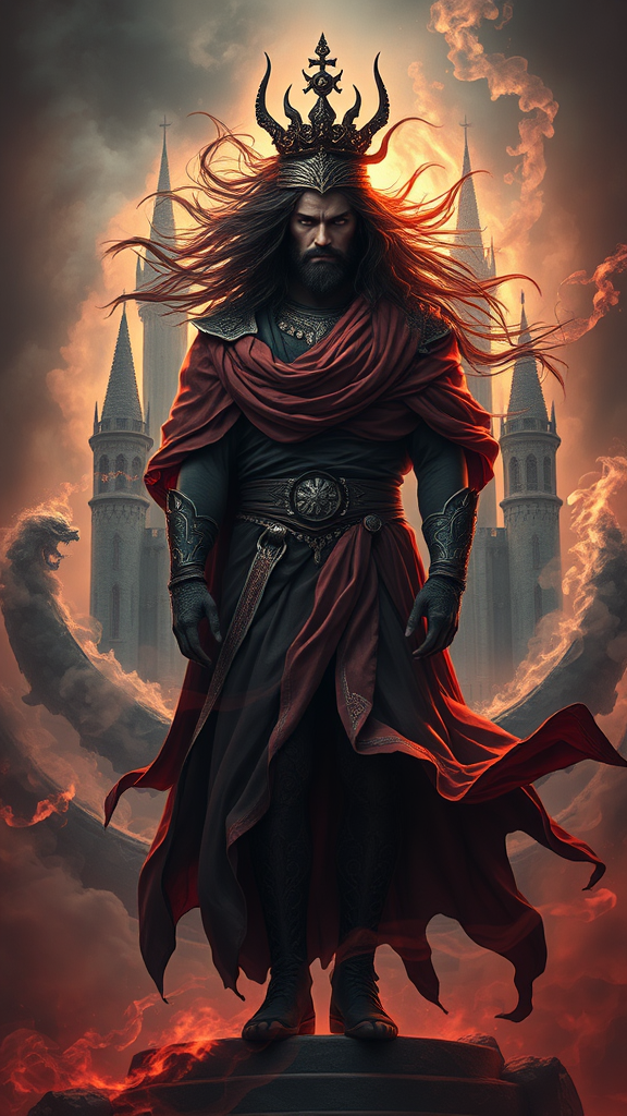 A majestic figure with royal bearing stands in a mesmerizing portrait, surrounded by an aura of darkness. Their long, windblown hair and flowing cloth ripple with an otherworldly energy, reminiscent of Magic the Gathering’s mystique. The scene bursts with vibrant contrasts, as clouds of toxic fumes and smoke swirl around in spirals, forming ghostly apparitions against the backdrop of a colossal, foreboding castle. The figure strikes a stunning pose, their features highlighted by dramatic shadows and intricate details. Elements of orthodox symbolism weave through the ambient setting, enhancing the emotional depth of this tribal dark fantasy. Rendered in ultra-detailed 3D quality using Octane and Unreal Engine, the piece is enhanced with cinematic lighting and ambient occlusion, capturing the viewer's imagination. The isometric perspective adds depth, while VFX elements create a truly immersive experience. Made in Blender, the ultra-realistic 8k resolution ensures every detail stands out, making this scene an ideal wallpaper.