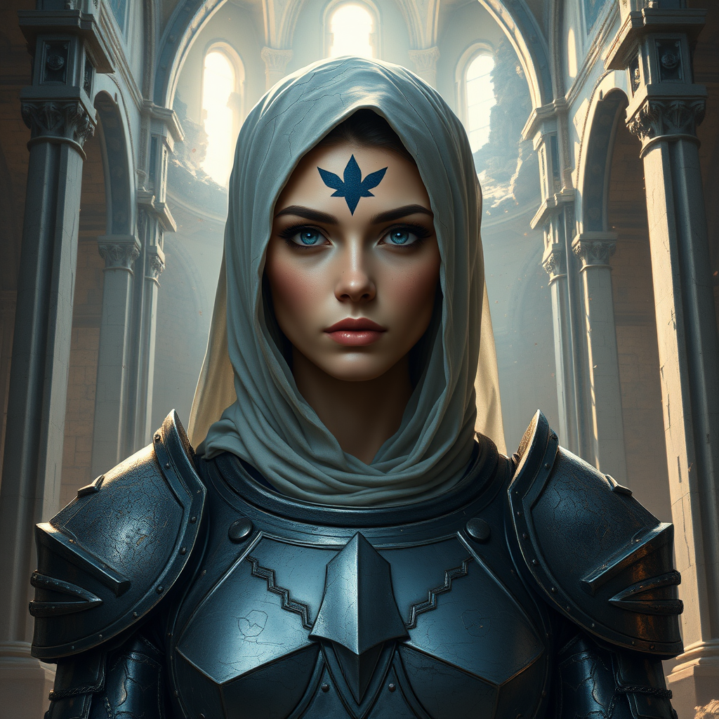 A majestic full-body portrait of a stunning woman, renowned as the most beautiful sister of battle, standing in the center of a dilapidated cathedral. Her face is intricately detailed and symmetrical, with reflective eyes, dark eyebrows, and expertly applied makeup. Her armor is worn and cracked, reflecting her resilience and strength, and is portrayed in the Warhammer 40k style. The backdrop reveals ruined marble walls with dust particles floating in the air, accented by bullet holes and structural cracks. Dramatic lighting, including rim lighting, enhances the scene’s atmosphere. The piece captures the essence of professional majestic impressionism, drawing inspiration from artists like Waterhouse, John Constable, Ed Blinkey, Atey Ghailan, Jeremy Mann, Greg Manchess, and Antonio Moro. The setting features a vivid and detailed composition trending on ArtStation and CGSociety. The woman has a forehead tattoo partially obscured by a veil and headwear, and her steel armor gleams subtly under the light. This intricate, high-detail scene is portrayed as an oil painting, emphasizing beauty amidst chaos, showcasing artistic trends with impeccable craftsmanship.