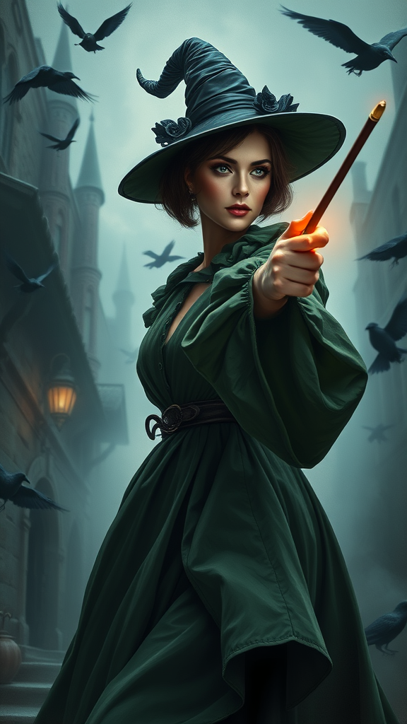 A majestic full body portrait of the world's most powerful witch, confidently aiming her wand as she casts an enchanting spell. She strides forward with purpose, her beautiful short hair framing a face adorned with perfectly applied makeup and striking reflective eyes. Her cute nose adds charm under the dramatic chiaroscuro and rim lighting. The setting is a misty gothic Victorian town, where crows flutter around. The witch's flowing green dress features intricate puffy sleeves, enhancing her commanding presence. The scene is painted with professional majestic impressionism, reminiscent of artists like Waterhouse, John Constable, and Ed Blinkey. The canvas showcases high detail and drama, trending on platforms like ArtStation and CGSociety, echoing the styles of Makoto Shinkai and Jeremy Mann. Despite a touch of weird colors and deliberate blurriness, the overall composition remains a compelling fusion of artistic mastery and enchanting allure.