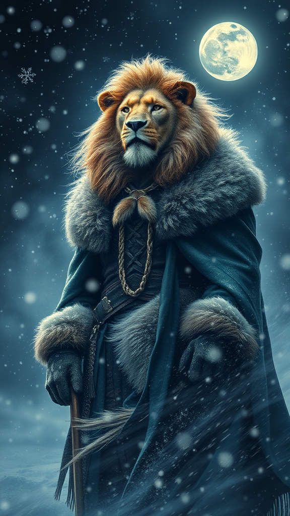A majestic fusion of a man and a lion stands tall in the swirling blizzard of a winter night, his mane merging seamlessly with the fur-lined cloak wrapped around him, the icy wind whipping through the ethereal landscape. Illuminated by the moon's glow, his piercing eyes reflect both wisdom and primal power as snowflakes dance in the darkness around him. The scene unfolds like a fantastical painting by Greg Rutkowski, capturing the raw beauty and mythical essence of this powerful guardian of the frozen wilderness.