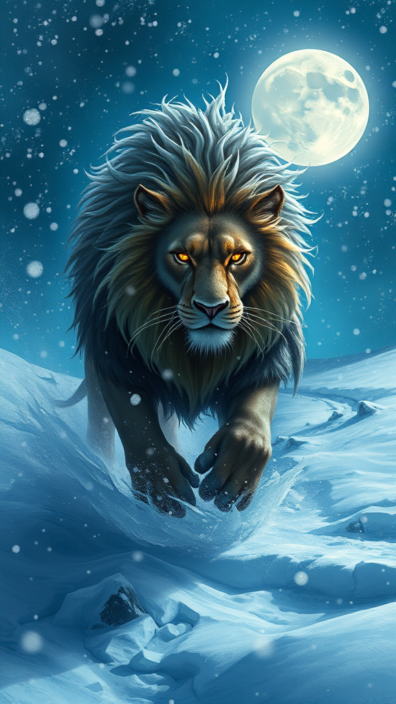 A majestic fusion of man and lion roams through a fierce blizzard on a cold winter night, cloaked in thick, opulent furs, exuding an aura of raw power and mystical presence. The creature's mane flows like a crown of icy tendrils, its eyes glowing with an otherworldly light against the swirling snow. A fantasy landscape painted in shades of blue and white unfolds around it, illuminated by the shimmering moonlight, reminiscent of a scene brought to life by the imaginative brush of Greg Rutkowski, where magic and nature intertwine in a captivating dance.