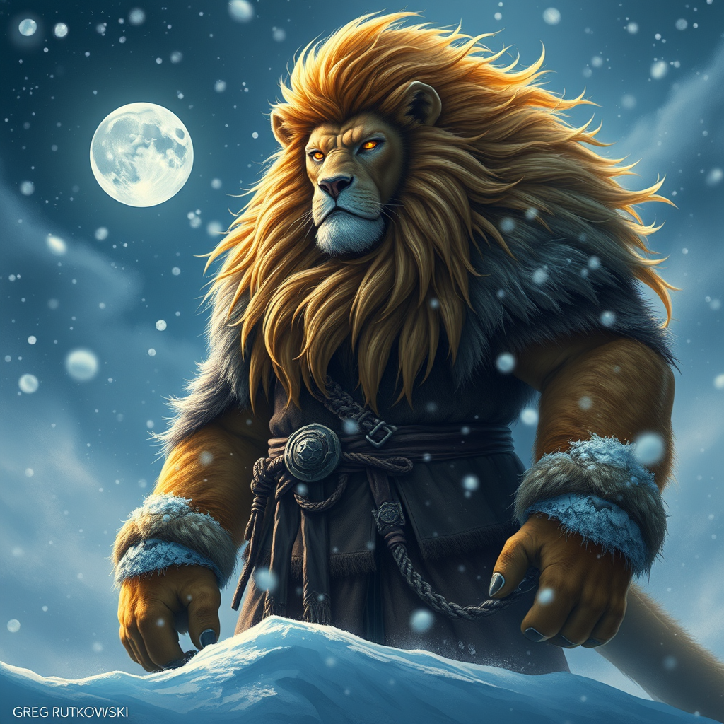 A majestic fusion of man and lion stands tall, his powerful form cloaked in thick furs to combat the relentless blizzard swirling around him. The biting winter night is his domain, as snowflakes dance in the air, settling on his golden mane that glimmers in the moonlight. This fantasy creature exudes a formidable presence, his eyes glowing with an otherworldly intensity that mirrors the harsh beauty of the frozen landscape, inspired by the enchanting artistry of Greg Rutkowski.
