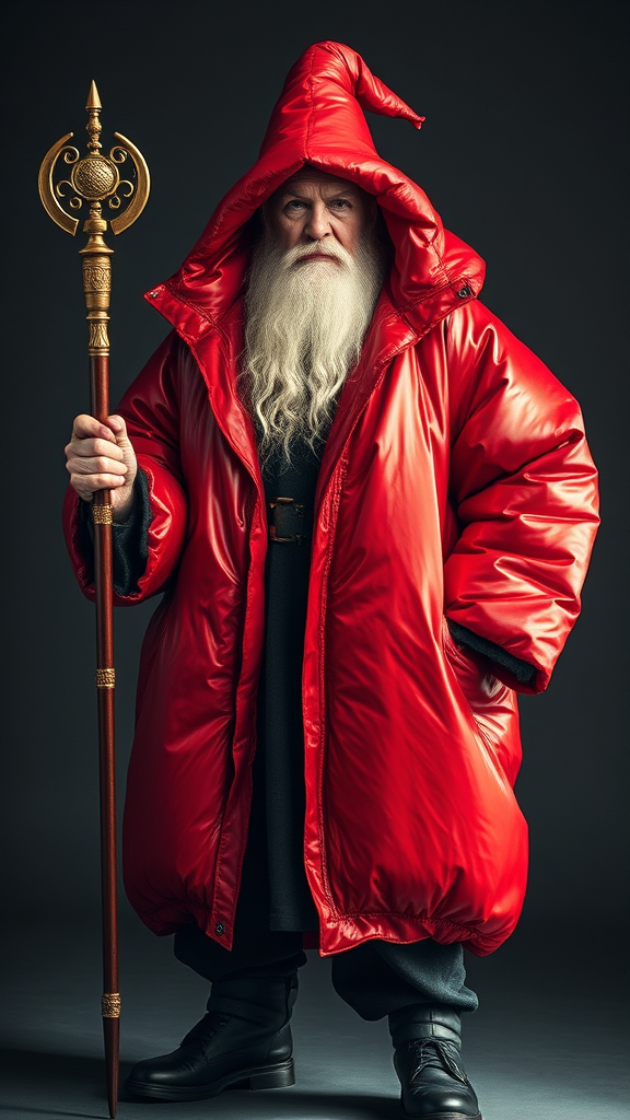 A majestic Gandalf stands holding a scepter, illuminated under the soft, indirect lighting characteristic of a high-fashion editorial shoot. His metallic red inflatable oversized jacket, a striking creation by Yeezy and Balenciaga, contrasts dramatically with his renowned wise demeanor. The focus is sharp, capturing every intricate detail of this unique attire. Gandalf’s presence exudes a cinematic glamour — the symmetrical balance of his pose enhances the overall allure. The portrait, evocative of full-body paintings, achieves the elegance synonymous with Vogue’s highest standards. His skin, showing the tales of his age, adds authenticity while maintaining the visage’s clarity. The entire scene encapsulates a fusion of fantasy and modern fashion, rendered without error, showcasing Gandalf’s iconic character in an unexpected yet captivating realm.