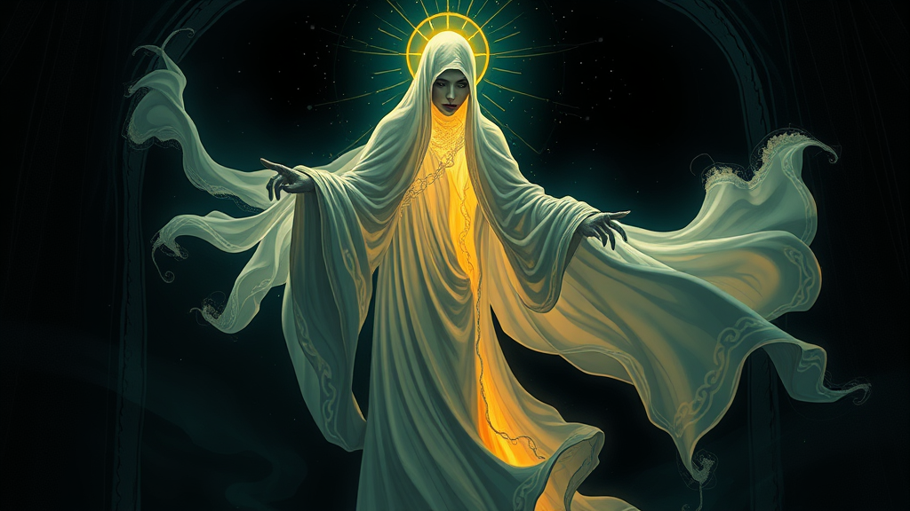 A majestic ghostly figure draped in flowing, elegant robes emerges from the shadows, illuminated by a celestial light that casts an ethereal glow around it; the scene is a harmonious blend of darkness and luminescence, capturing a serene yet powerful presence. The artwork exudes an Art Nouveau style reminiscent of Alphonse Mucha, with intricate patterns and delicate linework, while the vibrant colors and dramatic contrasts channel the modern flair of Artgerm and Greg Rutkowski, making it a captivating and trending piece on Artstation.