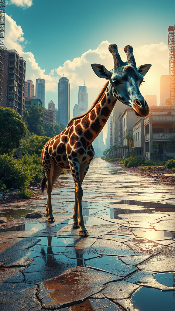 A majestic giraffe meanders through a dystopian post-apocalyptic cityscape, where nature has reclaimed the vibrant metropolis with lush, overgrown vegetation. The city is awash in a kaleidoscope of colors, contrasting with the deteriorating urban ruins. Reflective puddles shimmer on the cracked streets under the radiant sunshine, casting intricate patterns of light and shadow. The scene is highly detailed with a cinematic quality, captured in 8k resolution with octane rendering that emphasizes every nuance. The giraffe's head is a striking blue with unique, disfigured features, adding an otherworldly touch to the surreal landscape.