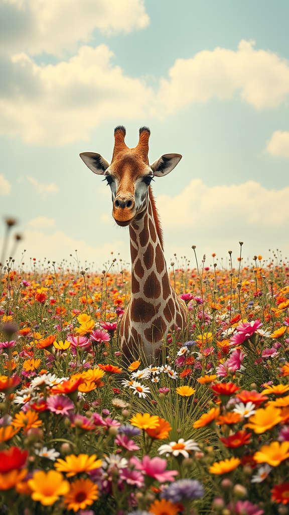 A majestic giraffe nestled within a sea of vibrant flowers, inspired by Arne Thun's vision, infused with Natalia Rak's dynamic flair, rendered in stunning 8k resolution. The scene exudes vintage aesthetics, reminiscent of timeless wallpaper designs, with subtle movements akin to animated gifs. Naoto Hattori's influence shines through in the hyper-realistic details, capturing an ethereal blend of nature and artistry, with an elongated vertical aspect ratio for an immersive experience.