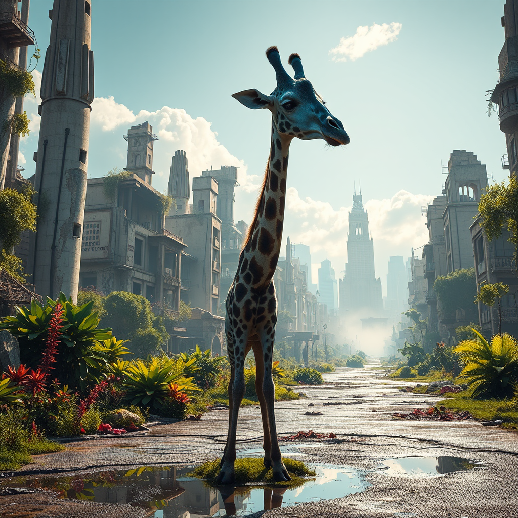 A majestic giraffe with a striking blue head, slightly disfigured yet graceful, stands amidst a dystopian post-apocalyptic cityscape overgrown with lush, vibrant vegetation. The city's crumbling edifices are bathed in the brilliant light of a bright sunny day, casting cinematic shadows and highlights across the scene. Puddles reflecting the surreal environment add a layer of dreamlike beauty, and the atmosphere feels alive with nature reclaiming its territory. This highly detailed and realistic 8k depiction showcases a clash between the remnants of human civilization and the resilient beauty of wildlife, enhanced by the transformative power of nature and cinematic lighting.
