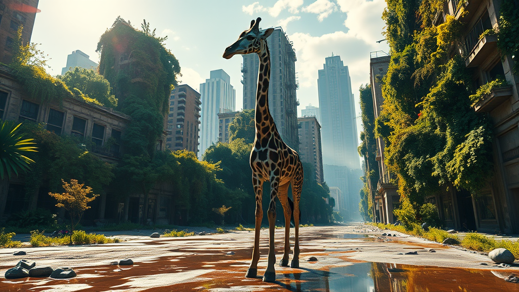 A majestic giraffe with a striking blue head stands gracefully in a dystopian post-apocalyptic city that bursts with vibrant colors, lush vegetation sprawling across crumbling skyscrapers. Patches of sunlight break through the overgrown foliage, creating a dance of light across reflective puddles scattered throughout the streets. The giraffe, though slightly disfigured, exudes an air of surreal beauty, its elongated form silhouetted against the backdrop of a bright sunny day. The scene is rich in detail, highly realistic, with cinematic lighting that enhances the enchanting yet eerie atmosphere of the landscape, captured in an 8k octane render.