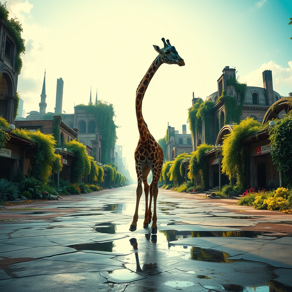 A majestic giraffe with a striking blue head, subtly altered by the passage of time, wanders through a dystopian post-apocalyptic city brought to life with vibrant colors as nature has reclaimed it with lush greenery. The scene is set under a bright, sunny sky, where the architectural remains are draped in vines and flowers. Reflective puddles scatter across the uneven, cracked streets, capturing the vivid tapestry of the day. The scene is realistically detailed, rendered with cinematic lighting that brings an ethereal glow to the overgrown metropolis, creating an 8k visual narrative of resilience amidst decay.