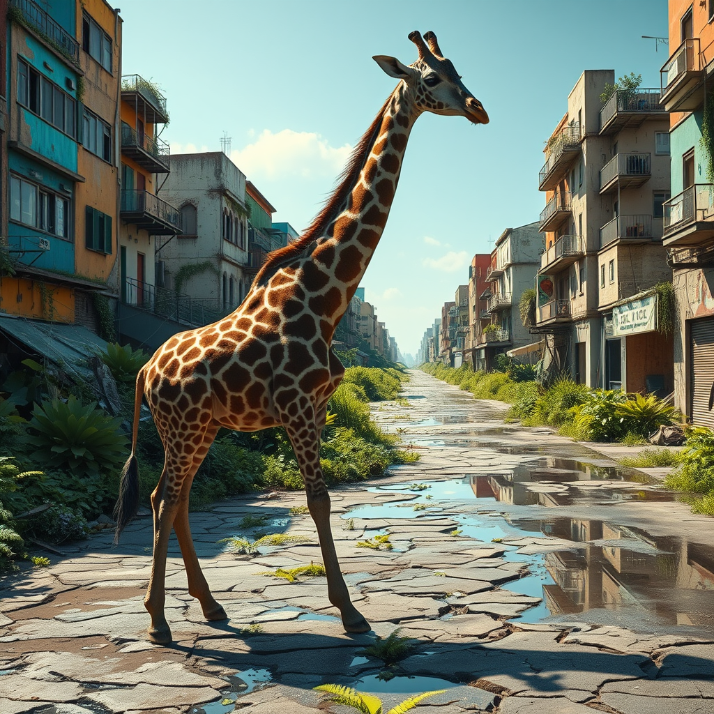 A majestic giraffe with a striking blue head wanders through a dystopian post-apocalyptic city, its neck gracefully rising above the vibrant tangle of overgrown vegetation. Reflective puddles dot the cracked streets, capturing the bright sunlight of a clear day. The scene is rendered in stunning realism, each detail meticulously captured in cinematic 8k quality with octane lighting. The giraffe's form, slightly disfigured yet still beautiful, stands out against the backdrop of colorful, crumbling buildings overtaken by nature’s relentless growth. A gentle breeze rustles the leaves, and the soft sound of trickling water adds life to the abandoned urban landscape, creating a hauntingly serene atmosphere.