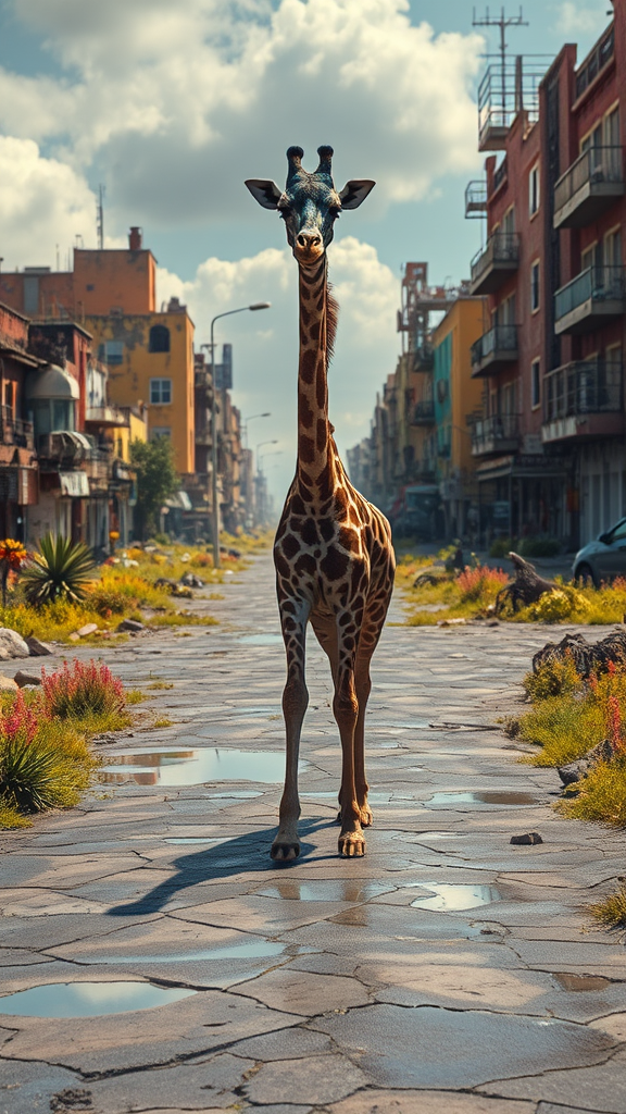 A majestic giraffe with a uniquely blue head wanders through a dystopian post-apocalyptic cityscape, where vibrant vegetation has reclaimed the colorful ruins of civilization. Puddles scattered across cracked streets reflect the bright, sunny sky, casting captivating patterns of light. The giraffe, with its slightly disfigured yet striking appearance, stands as a surreal sentinel amid the chaos. Each detail of this scene is rendered with hyper-realistic precision, capturing the intricate textures of crumbling buildings and flourishing plants under cinematic octane lighting. This 8k image blends the beauty of nature's resurgence with the haunting remnants of a once-thriving urban world.