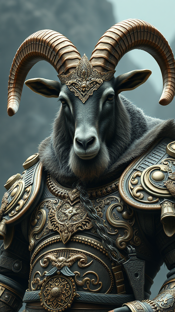 A majestic goat warrior adorned in opulent, intricately crafted viking armor, exuding an aura of both elegance and power. The armor is a masterpiece of hypermaximalist design, with elaborate engravings and luxurious embellishments that reflect an elite, ominous presence. The scene feels haunting and otherworldly, rendered in the style of a cinematic matte painting. The atmosphere is a blend of fairy tale mystique and epic fantasy, reminiscent of the works of James Jean, Brian Froud, and Ross Tran, capturing the enigmatic allure of legendary creatures in a surreal, dreamlike setting.