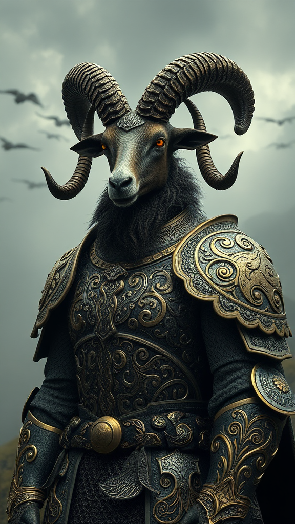 A majestic goat warrior clad in opulent Viking armor stands amidst a brooding, mist-laden landscape. The figure exudes an air of ominous elegance, its armor intricately detailed with swirling engravings, shimmering in muted gold and silver tones. This creature's eyes gleam with a haunting intensity, set against a backdrop of stormy skies. Elaborate, ornamental designs weave across its sturdy frame, blending seamlessly with nature's own motifs, creating a tapestry of luxury and mystery. The scene, captured with the precision of a cinematic matte painting, is reminiscent of the fantastical realms of James Jean, Brian Froud, and Ross Tran, blending the hypermaximalist style into a mesmerizing tableau of beauty and power.