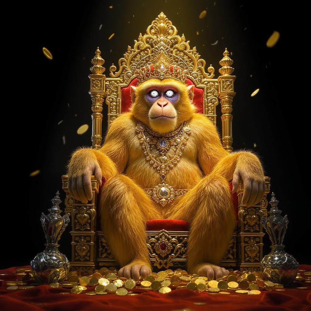 A majestic gold monkey sits atop a throne, surrounded by an aura of divine opulence. Its eyes gleam like diamonds, reflecting a wealth of wisdom and mystery. The scene is enriched with shimmering gold coins and silver artifacts scattered around, bathed in cinematic lighting that enhances their brilliance. The black background accentuates the surreal and hyper-realistic details of the monkey's fur and the intricately designed throne. Each element is rendered with ultra-high resolution, capturing every nuance of texture and light, as if shot with a state-of-the-art DSLR and enhanced by Unreal Engine 5. The atmosphere combines the grandeur of a god-like presence with the allure of immense wealth, creating a photorealistic masterpiece that transcends reality.