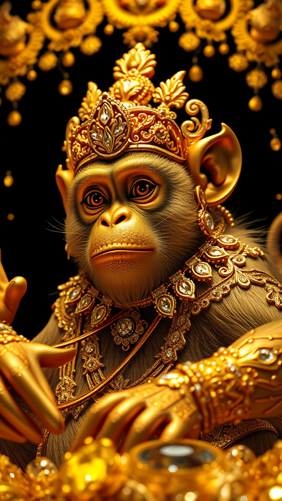 A majestic golden monkey adorned with intricate designs, embodying the essence of a deity, surrounded by an opulent array of shimmering gold, radiant diamonds, and polished silver, set against a deep black backdrop. The scene is ultra detailed and cinematic, capturing a surreal yet hyper-realistic portrayal, reminiscent of the sharpness seen in high-end DSLR photography. The atmosphere is enhanced by cinematic lighting, producing a high-resolution, photo-realistic image with the clarity and depth of an 8k ultrarealistic octane render.