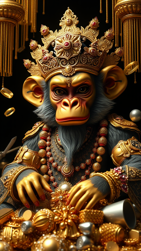 A majestic golden monkey deity adorned with intricacies of wealth, embodying godly opulence amidst a cascade of riches—gold, diamonds, and silver all around. Set against a deep black background, the scene is ultra detailed, with a cinematic, photorealistic touch. The surrealistic depiction is captured in stunning 4K and 8K resolutions, showcasing hyper-realism through the lens of a DSLR, powered by Unreal Engine 5. This high-resolution octane render delivers a cinematic shot with masterful lighting, exuding both a photo-realistic and hyper-realistic essence, maintaining the grandeur of the core concept.