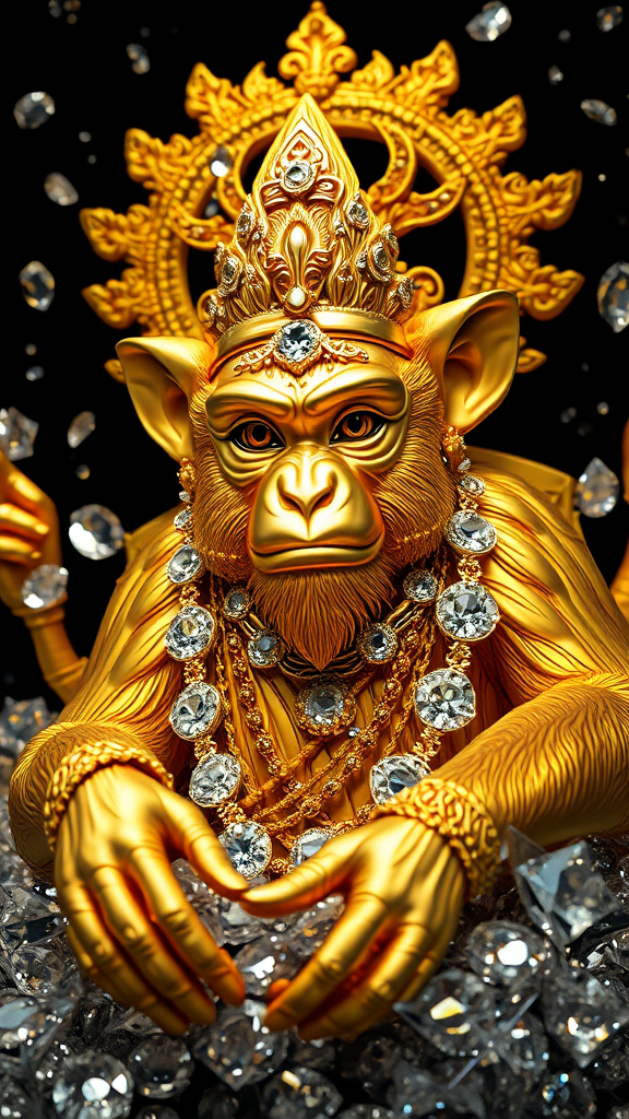 A majestic golden monkey exuding an aura of divinity, ensconced amidst an opulent array of glittering diamonds and lustrous silver, set against a deep black background. The scene is ultra-detailed, capturing every minute texture with cinematic lighting. Each element is rendered in photorealistic detail, appearing surreal yet hyper-realistic, as if captured with a DSLR lens. The composition boasts 4K clarity, with an 8K resolution that enhances the richness of the scene, rendered with the power of Unreal Engine 5 and high-res octane technology. The setting evokes a dreamlike yet eerily real ambiance, showcasing a captivating tableau of wealth and divinity.