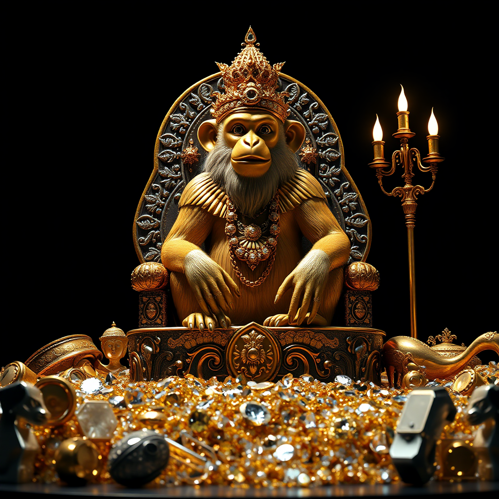 A majestic golden monkey sitting atop a throne of shimmering treasures, embodying the essence of a god. Surrounded by a dazzling array of riches, including sparkling diamonds, lustrous silver, and glistening gold, set against a deep black background. The scene is captured in ultra-detailed, cinematic fashion, exhibiting a photorealistic, hyper-realistic quality. The composition is in stunning 8K resolution, with ultrarealistic textures rendered through Unreal Engine 5, utilizing high-resolution octane render for exceptional clarity. The lighting is cinematic, casting dramatic highlights and shadows to emphasize the surrealistic ambiance of the scene, captured as if through a DSLR lens for maximum realism, rendering a mesmerizing and dreamlike visual.