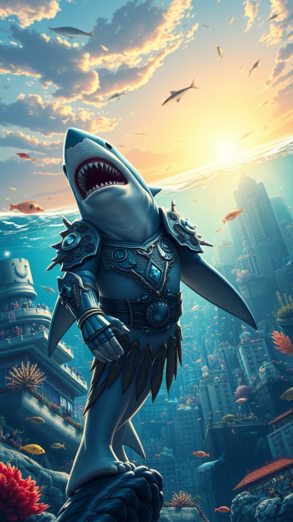 A majestic great white shark superhero adorned with intricately ornate armor stands proudly in the bustling city of Atlantis, depicted in an epic cinematic movie poster style. The underwater metropolis is alive with colorful marine life and glistening water, set against the soft hues of dawn. The scene captures the essence of anime and manga graphics with vivid, bright colors and high detail. The poster showcases cinematic lighting, emanating a sense of joy and heroism. The artwork is designed for an 8K HD, CMYK offset print, exuding vibrant energy and intricate visual storytelling.