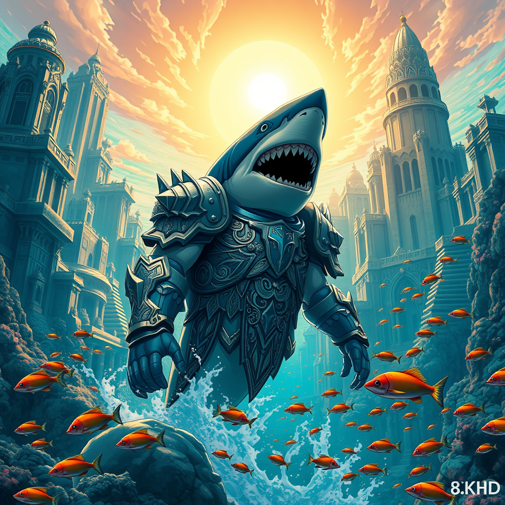 A majestic great white shark superhero clad in intricate, ornate armor stands proudly in the heart of the mythical city of Atlantis, towering amidst ancient, coral-clad skyscrapers. This cinematic movie poster bursts with anime and manga-inspired graphics, where vivid water and schools of vibrant fish swirl dynamically in the background. The scene is set at dawn, casting a golden glow and vibrant colors across the underwater metropolis, enhanced by dramatic, cinematic lighting. The artwork captures high detail in 8K HD, reminiscent of offset printing, with bright hues reflecting off the shark's armor, embodying an aura of happiness and valor.
