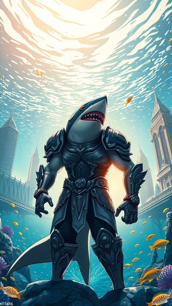 A majestic great white shark superhero dons intricate, ornate armor, standing proudly amidst the legendary city of Atlantis. The underwater metropolis thrives with vibrant aquatic life and shimmering architecture visible through crystal clear waters. In the background, schools of colorful fish flit about, harmonizing with the aquatic theme. The scene is set at dawn, casting a warm, golden glow over the futuristic city and enhancing the superhero's powerful silhouette. Styled as a cinematic movie poster, the artwork combines anime and manga graphics, utilizing bright colors and intricate details for a captivating display. The high-definition 8K image is suitable for offset printing, exuding a joyful atmosphere with its cinematic lighting and exceptional detail, designed in a portrait orientation to encapsulate the grandeur of the scene.
