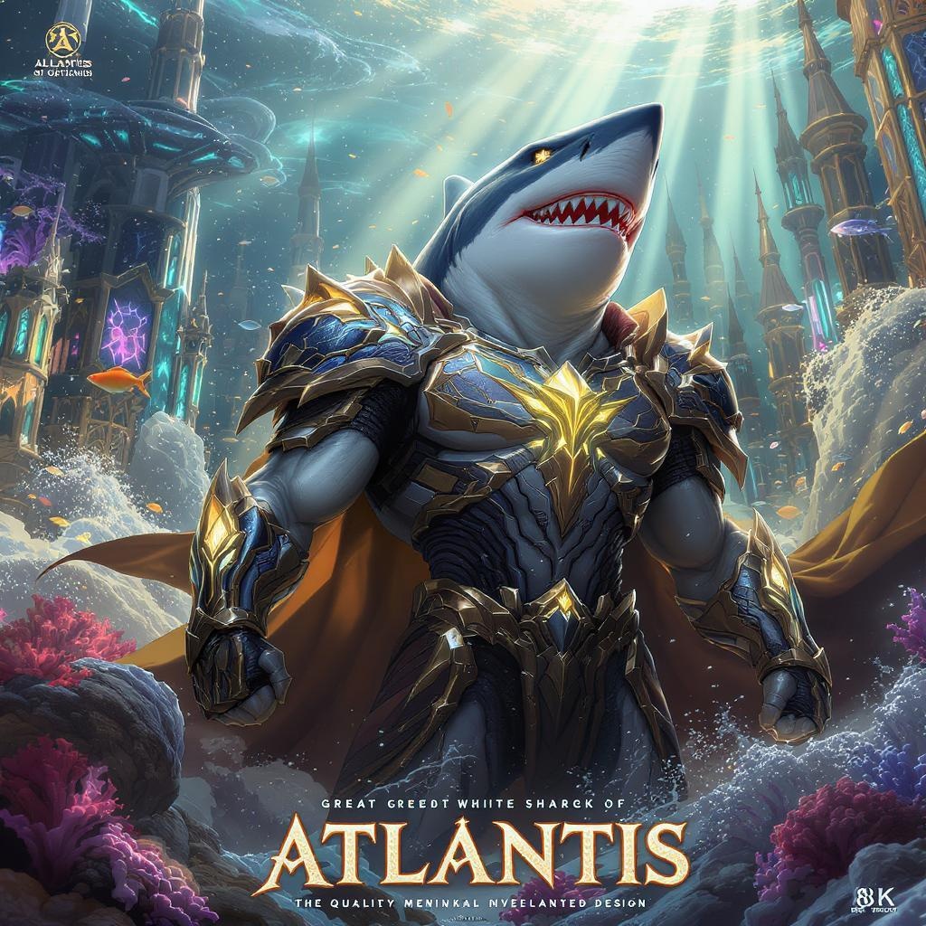 A majestic great white shark transformed into a superhero adorned in intricate, ornate armor stands proudly in the vibrant city of Atlantis. The backdrop features a bustling underwater metropolis filled with exotic marine life, adding to the scene's mystique. Dawn light filters through the water, casting a golden hue over the cityscape and creating a dramatic, cinematic atmosphere. The visuals are rendered in vivid anime and manga style graphics, bursting with bright colors and intricate details. The poster is designed with high definition and offset printing techniques, ensuring every detail is captured with precision in 8K quality. The composition radiates a sense of joy and heroism, enhanced by cinematic lighting that highlights the superhero's formidable presence.